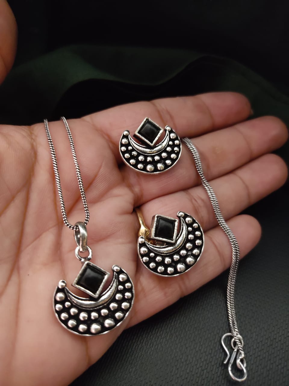 New Oxidises German Silver Brass Antique Original Choki Stone Delicate Chain P Set With Earings